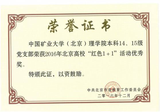 在2016年开展的北京市高校“红色1+1”活动中,我院各党支部积极组织开展,体现了理学院学子的服务先锋精神,并在活动中表现突出,获得了北京市高校“红色1+1”活动三等奖和优秀奖。