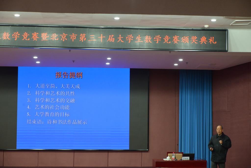 12月15日上午,中国科学院院士严加安教授应邀来我校做了《我心目中的科学与艺术》的报告,畅谈对科学与艺术的认识。我校师生以及前来参加第十一届全国大学生数学竞赛暨北京市第三十届大学生数学竞赛颁奖典礼的北京地区高校师生在我校交流中心二层报告厅仔细聆听了报告,并在会后与严院士进行了热烈互动!