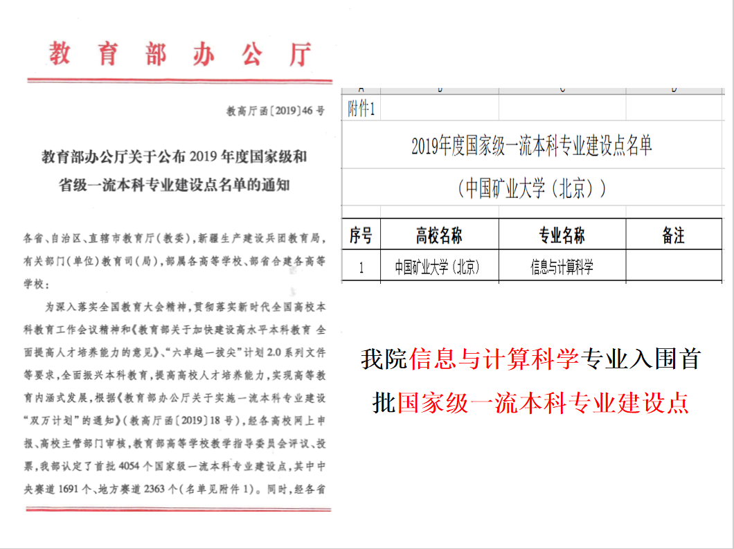 近日,教育部教高厅函[2019]46号文件公布了2019年度国家级和省级一流本科专业建设点名单,我院经过前期认真筹划和积极准备,最终信息与计算科学专业入选国家级一流本科专业建设点。
