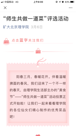 2020年上半年初正值新冠疫情施虐,全校师生相应国家号召,在家里进行网上教学和网上听课学习。三八妇女节一直是女老师女学生喜爱的节日,理学院分工会联合理学院学工办共同组织了迎三八“师生共做一道菜”网上评选活动,学院女老师和女学生积极参与此活动,女老师和学生们在自己的厨艺作品中表现出的积极乐观向上的生活态度,虽然天南海北被迫居家无法返校上课,但是我们的心是在一起的,在那个特殊时期热切期盼我们全中国人民早日战胜疫情。并在每一道菜品中传达了彼此的平安与祝福。该活动受到全校师生的广泛关注,阅读量达到2300余次,受到师生们的好评。