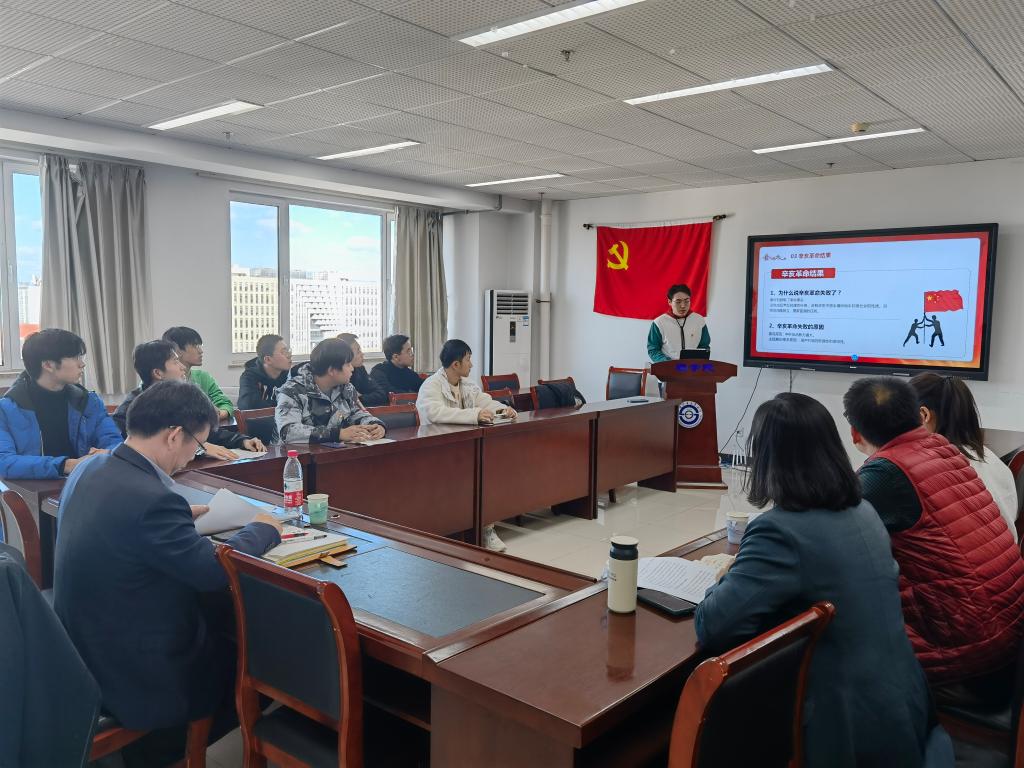 随后,刘波就辛亥革命与中国共产党的诞生,以及党的百年光辉历程展开了生动的讲述,并结合自身的学习体会及专业工作经验,带领支部成员回顾了建党百年来取得的伟大成就和中国工业化发展的伟大进程,深刻阐述了中国共产党为什么“能”、马克思主义为什么“行”、中国特色社会主义为什么“好”,让支部成员更加深刻体会到了百年来中华民族的改变,也更加坚定了学好本领、务实进取的信念。他表示,当今的美好生活是先辈们用生命和鲜血换来的,青年学子应当学习并铭记历史,更要传承革命先驱不朽的精神和信仰。