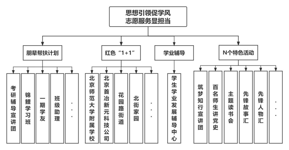 支部始终坚持以习近平新时代中国特色社会主义思想为引领,深入学习贯彻党的二十大精神,强化支部建设,严把党员发展质量关,以党建促班建带团建,积极构建“思想引领促学风 志愿服务显担当”的党支部工作机制,以思想引领为先导,充分发挥支部战斗堡垒作用和党员先锋模范作用,开展丰富的“助”学、“助”老等志愿服务系列活动,切实增强党支部的凝聚力、向心力和战斗力,激活“党建+”育人成效。结合理学院“Σ”学风建设品牌项目(其包含“魅力理学”文化塑造计划、“学在理院”学风养成计划、“逐梦职涯”就创培育计划、“携手沙河”朋辈帮扶计划、“党旗理航”学业辅导计划),支部凝练出“1+1+1+N”特色建设体系,着力将支部打造成“抓党建·促学风·重实践”的学习型、服务型特色党支部。