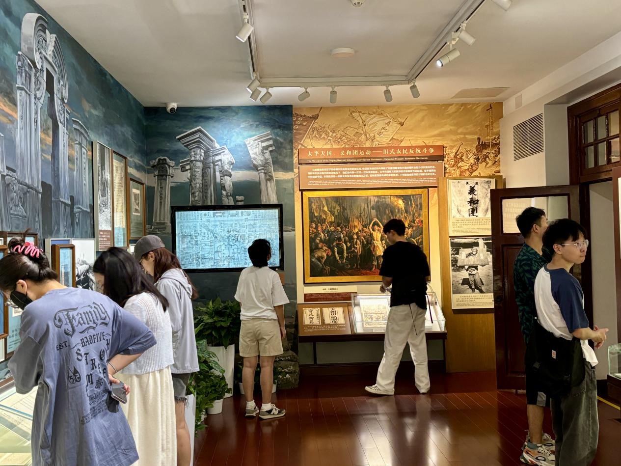 同学们跟随工作人员指导,走进红砖红瓦铺砌的展厅进行沉浸式参观。红楼共有59个展厅,包含办公室场景复原、新青年出版期刊、共产党宣言、五四前夜、打造马克思主义在中国早期传播的主阵地等等,通过场景复原、真实历史照片、文字资料以及全息影像等多种形式,呈现中国共产党从孕育萌芽到发展壮大的历史脉络。砖木结构的建筑,一下子将同学们拉回到那段激情岁月,漫步在红楼,用身体与心灵来感受这片陈独秀、李大钊、毛泽东、鲁迅、蔡元培、胡适等革命先辈和文化巨匠生活工作过的土地,仿佛听到了百年前房间内仁人志士们慷慨激昂、荡气回肠的思潮论辩。