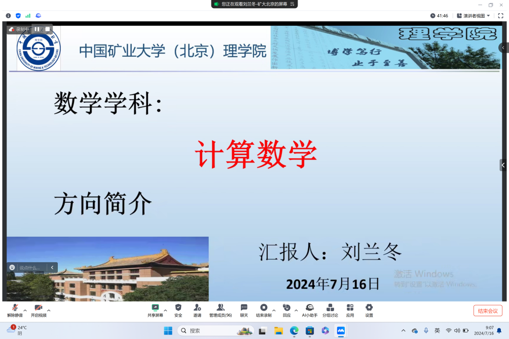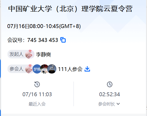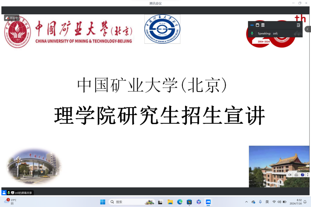 为了展现理学院的“双一流”学科建设发展水平、教学特色和师资队伍,促进国内各高校之间优秀本科生交流,加强学生对我院的了解,吸引更多的优质生源,中国矿业大学(北京)理学院于7月16日成功举办了2024年数学、统计学全国优秀大学生暑期云夏令营活动,吸引了来自全国各地的74所高校的一百多名优秀大学生参加。