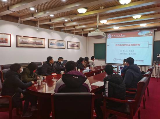 最后,计算数学与统计系参观教师和刘冬桥等重点实验室人员进行了座谈。刘冬桥副教授做了“岩石本构关系及岩爆研究”的报告,并就有关数学模型的使用和参观教师们进行了探讨。座谈中,双方就今后数学、力学、统计学学科交叉及合作,成立相关合作研究中心等事项进行了深入交流。