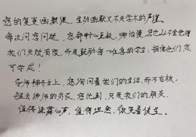每次的作业发下来之后都能看到高老师认真批改的字迹,被老师认真的态度所影响,同学们的作业完成的越来越认真。通过高老师生动的讲解,同学们切实学习体会到第一节课时高老师所说的:“复变函数是一门覆盖面很广非常有用的学科。”除此之外,高老师作为导师,经常关心学生们的学习和生活。他会在得知同学们比赛获奖时笑呵呵的恭喜同学们,也会时时督促大家认真准备考试,在同学们焦虑时安抚大家的情绪,是良师也是益友。