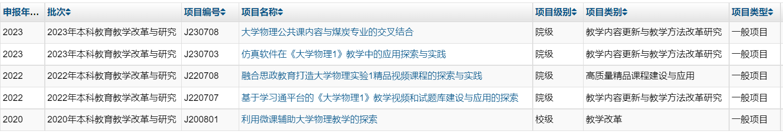 近年来,大学物理任课教师们正在通过有组织地承担各类教学改革项目进行大学物理课程资源的建设。目前,通过教改项目形式已经完成了大学物理课程微视频的资源建设,《大学物理1》线上试题库的建设,同时在建大学物理课程思政,大学物理公共课内容与煤炭专业的交叉结合,仿真软件在大学物理教学中的应用探索等项目。课程资源的建设,一方面为学生提供了自主学习的条件,另一方面也丰富了课程的考核评价方式。任课教师可以利用微视频和试题库资源布置课前预习任务和课后测验,并把完成情况计入平时成绩;利用线上试题库增加过程性考核,比如期中考试或月考,让教师和学生更能准确把握教与学的效果。大学物理课程的教学改革将进一步提高我校大学物理的教学质量,提高学生的培养质量。
